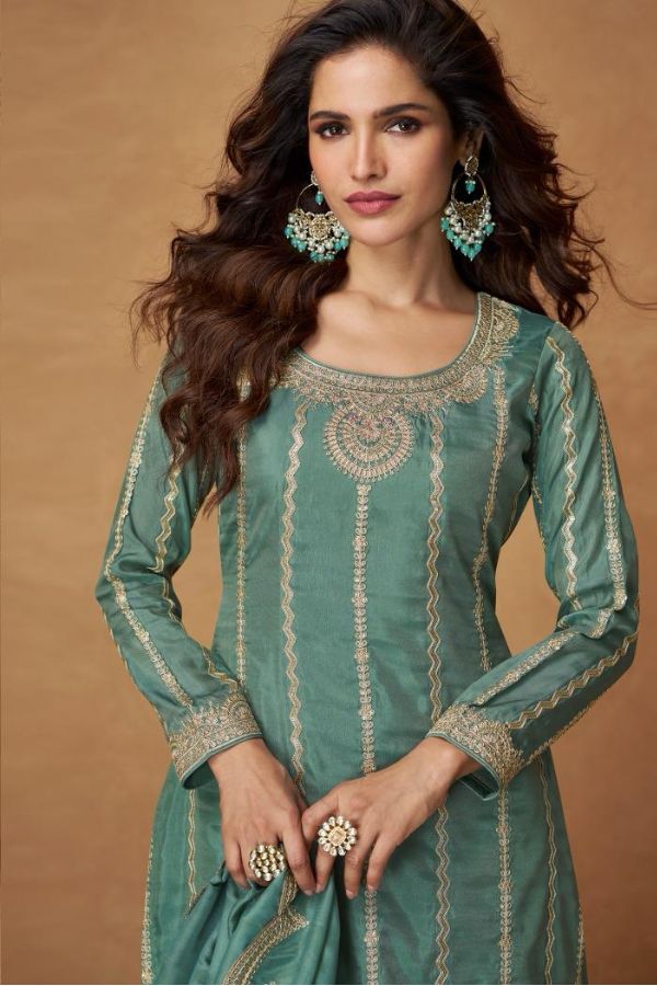 Noor – Moss Green Embroidered Organza Silk Suit | Free Size XL (Chest 42″)