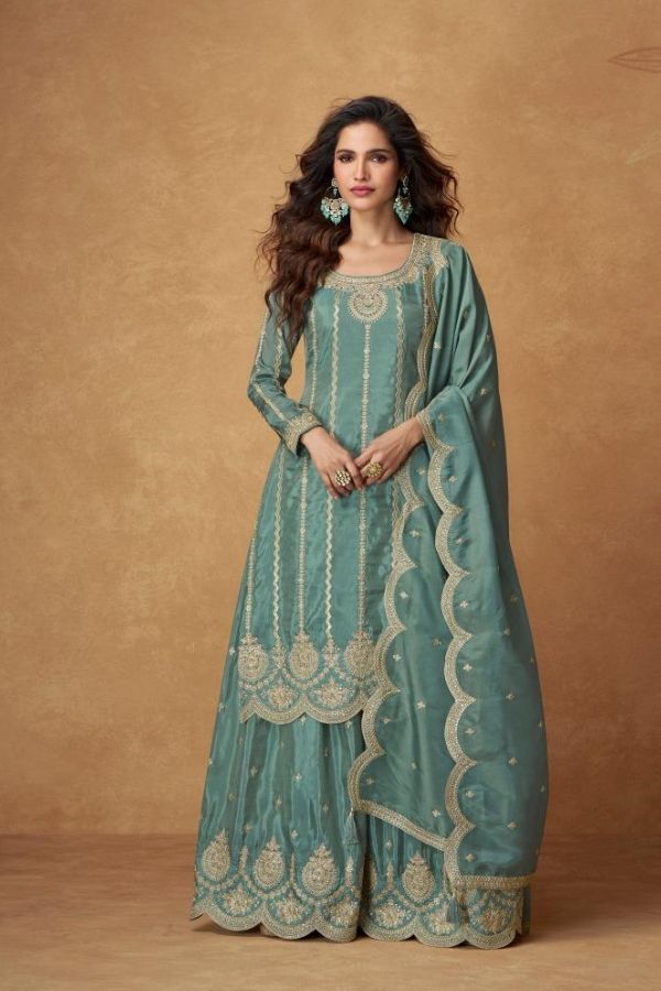 Partywear Chinon Silk 3-Piece Set with Heavy Embroidery Front Cut Top, Pant & Dupatta – Blue