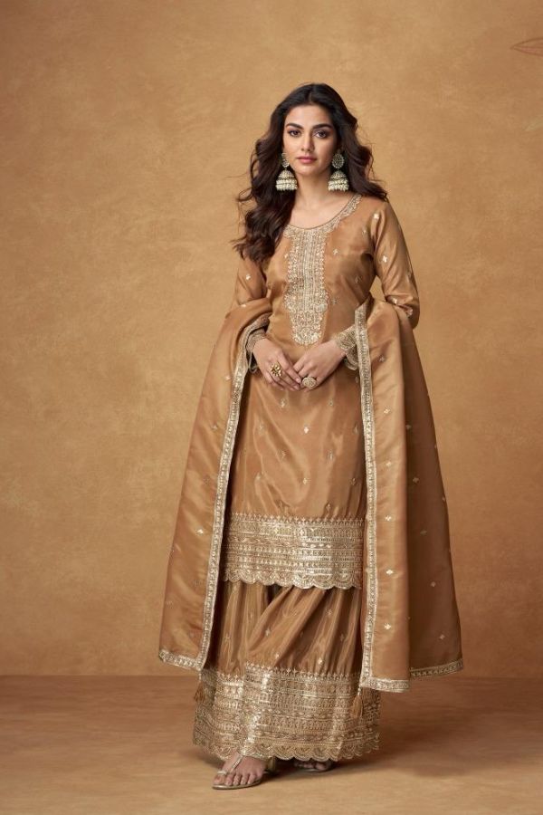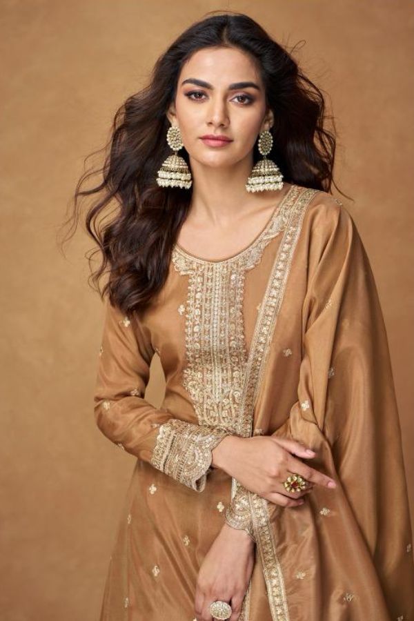 Aura – Golden Brown Organza Silk Suit with Embroidered Detailing | Free Size XL (Chest 42″)