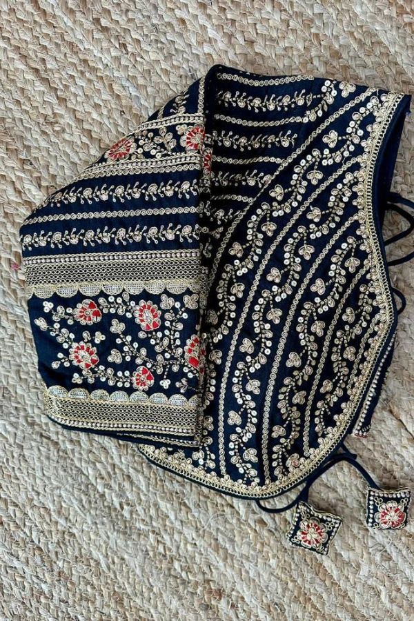 Make a bold bridal statement with this exquisitely crafted blouse, designed for the modern bride who appreciates traditional grandeur. Made from premium Heavy Milan Silk, this blouse features 21-inch long sleeves richly adorned with detailed embroidery, giving it a majestic appeal.