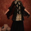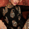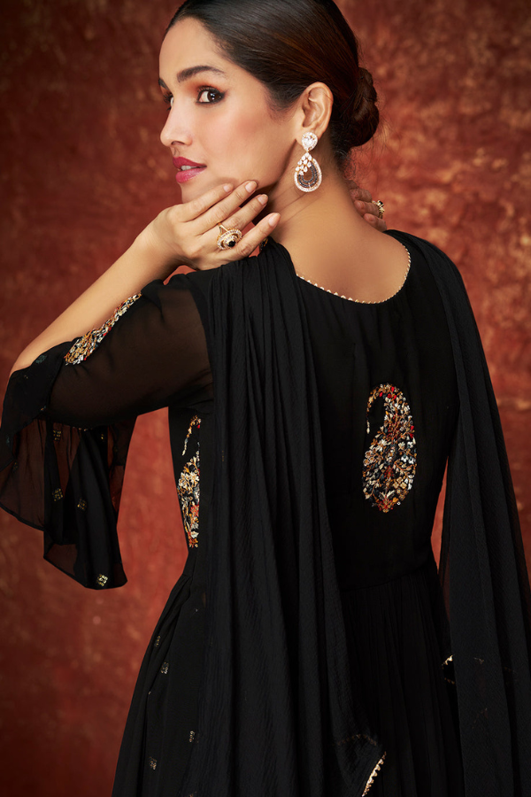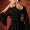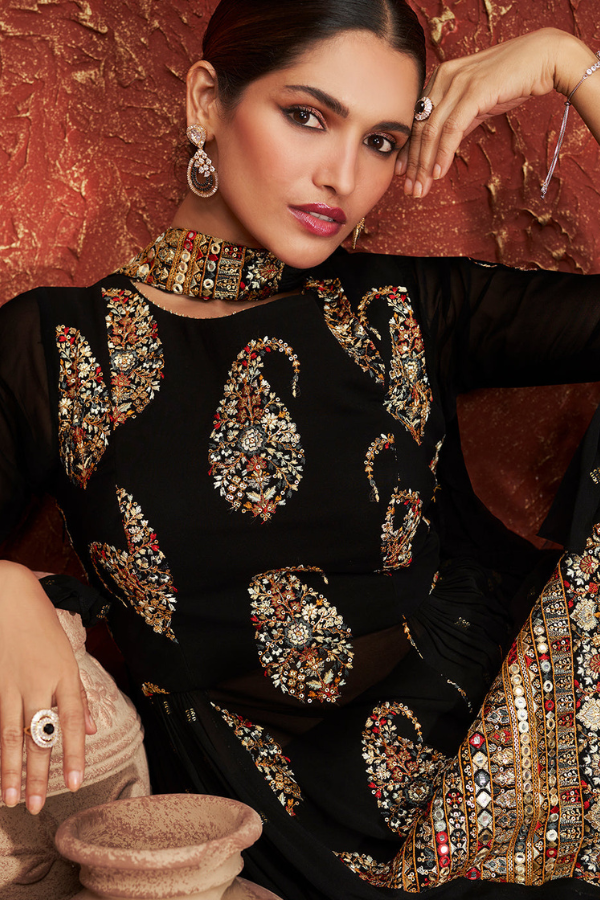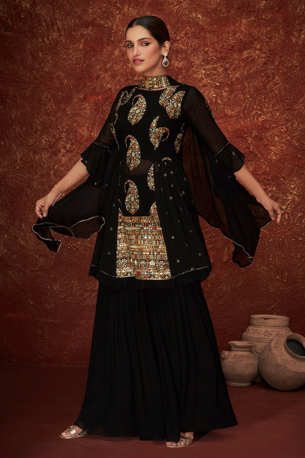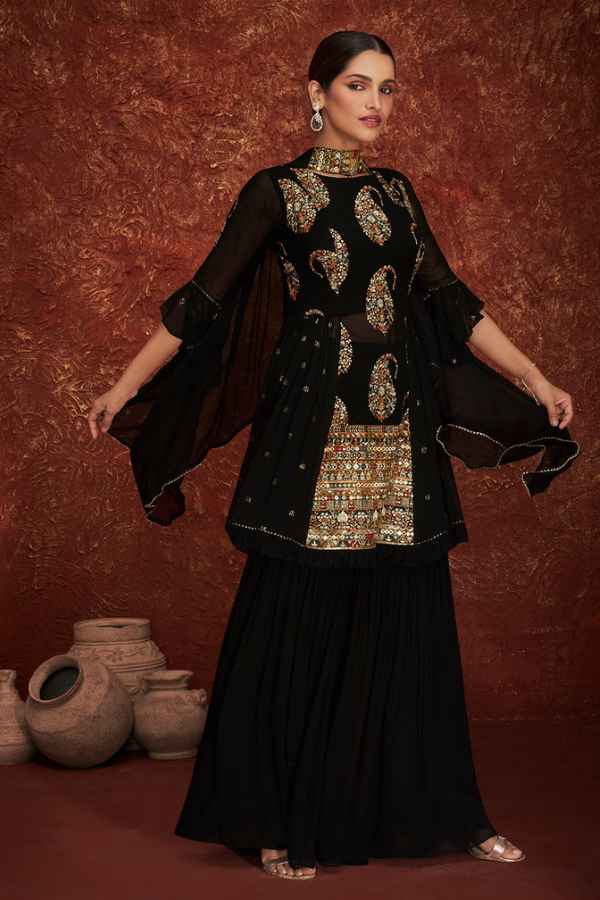Exude regal charm with this stunning black palazzo suit crafted from premium real georgette fabric. This ensemble features intricate gold embroidery, adding an aura of opulence and sophistication to your festive and formal wardrobe. The flared palazzo pants and elegant kurta ensure a comfortable yet stylish fit for every occasion.