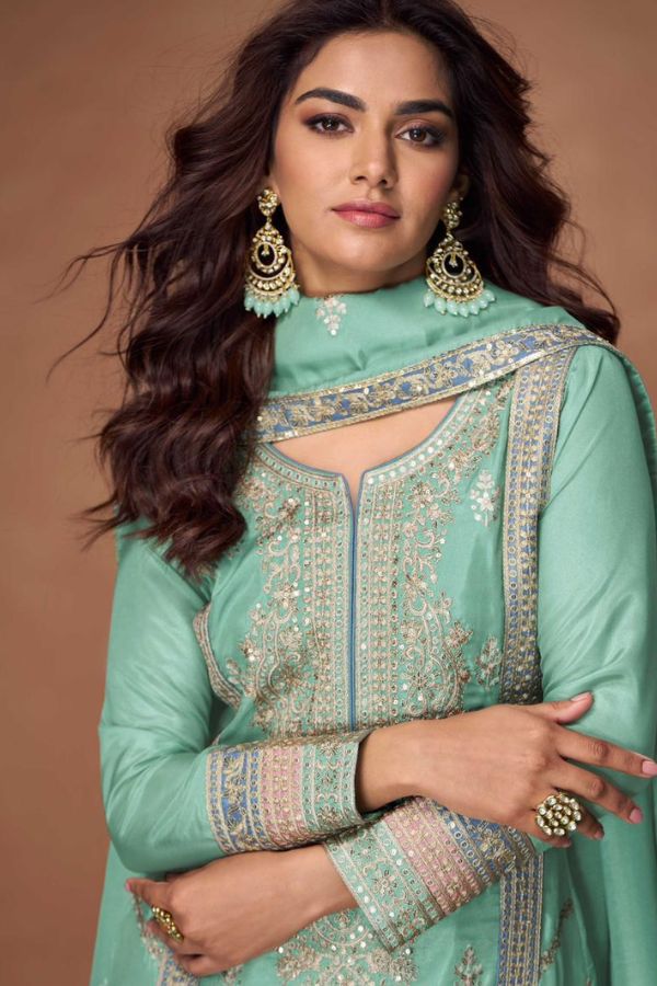 Paired with Black Cotton Satin Dhaka trousers, embellished with sequin–tilla embroidery on the hem, the set offers a perfect blend of style and comfort. The look is completed with a black organza crushed dupatta, framed with classic kiran lace, adding a soft, regal finish.