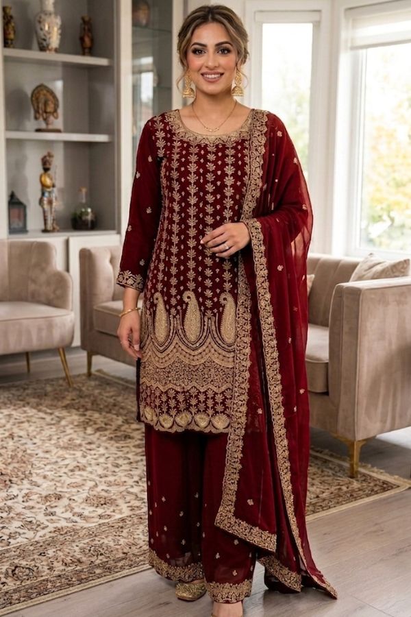 - 3-Piece Set: Includes embroidered top, matching bottom, and dupatta