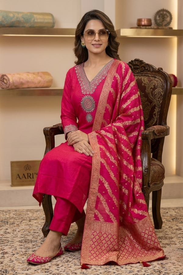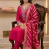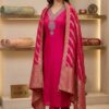 Elevate your style with our exquisite Raspberry Pink Embroidery Kurti paired with a stunning Jacquard Dupatta! Crafted from luxurious Dola Silk with a comfortable cotton lining, the Kurti boasts intricate embroidery and comes in lengths of 44 inches.