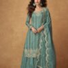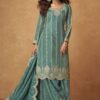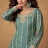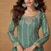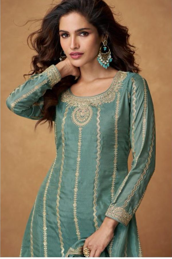 Bold yet graceful, this Moss Green suit features luxurious embroidery and royal detailing on rich Organza Simar Silk fabric. The intricate thread work and soft shine make it perfect for day-to-evening festive occasions or mehendi celebrations.