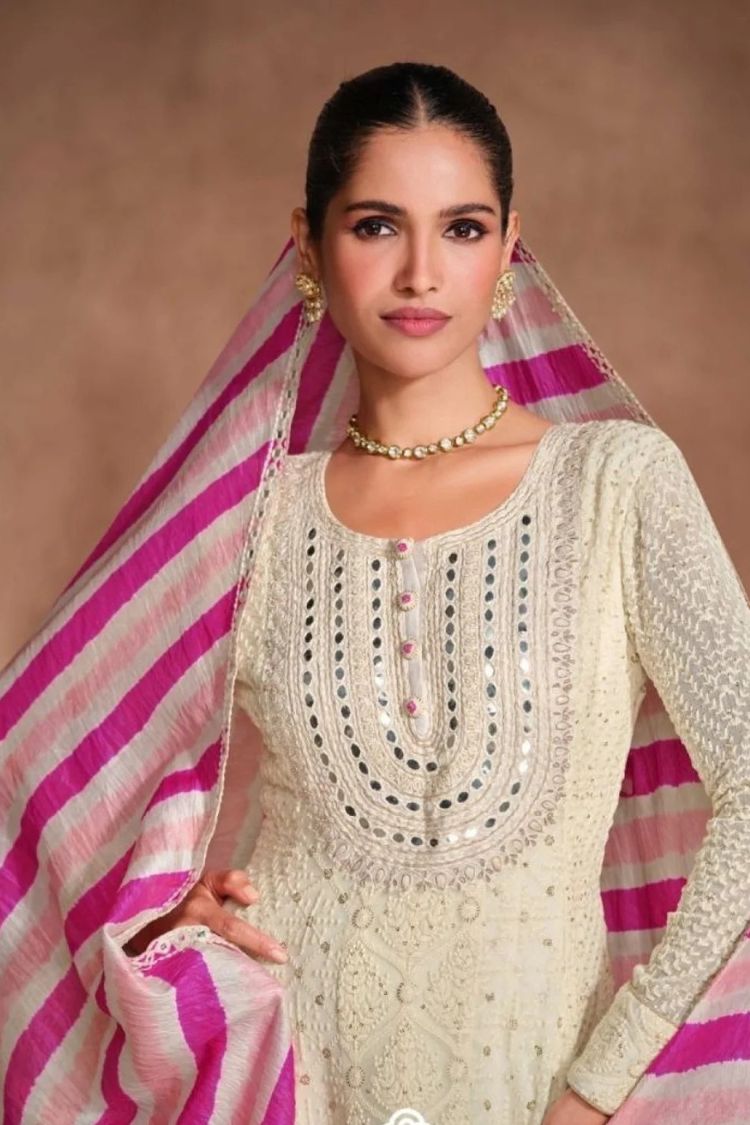 Experience timeless elegance with Rivaah, featuring stunning Chikankari embroidered outfits crafted from premium Real Georgette fabric. Each piece is beautifully detailed with heavy Chikankari embroidery and paired with an intricately embroidered matching dupatta, creating a graceful and complete ethnic look.